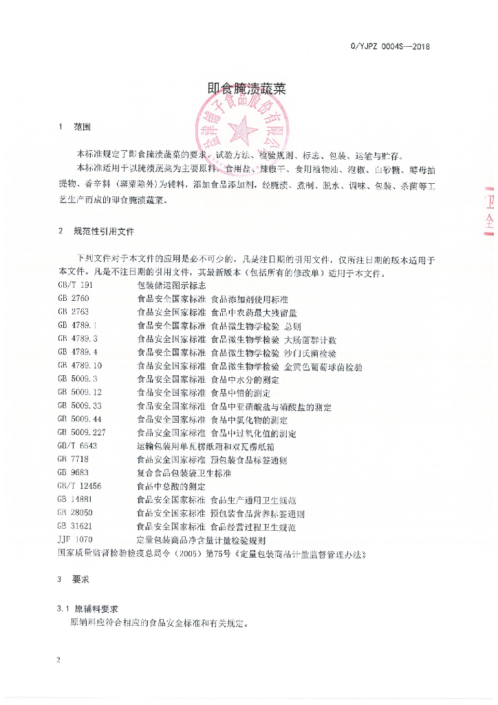 Q/YJPZ 0004S-2018 即食腌渍蔬菜