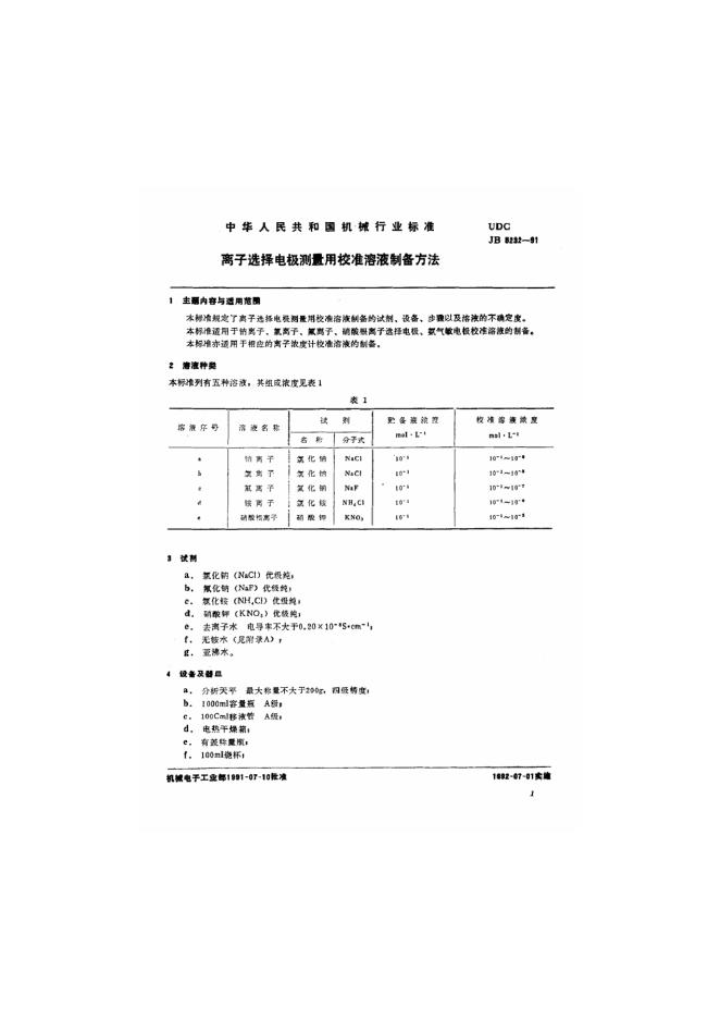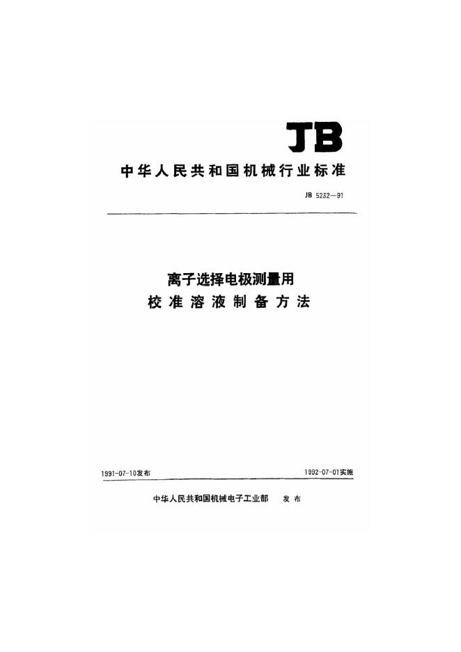 JB 5232-1991 离子选择电极测量用校准溶液制备方法