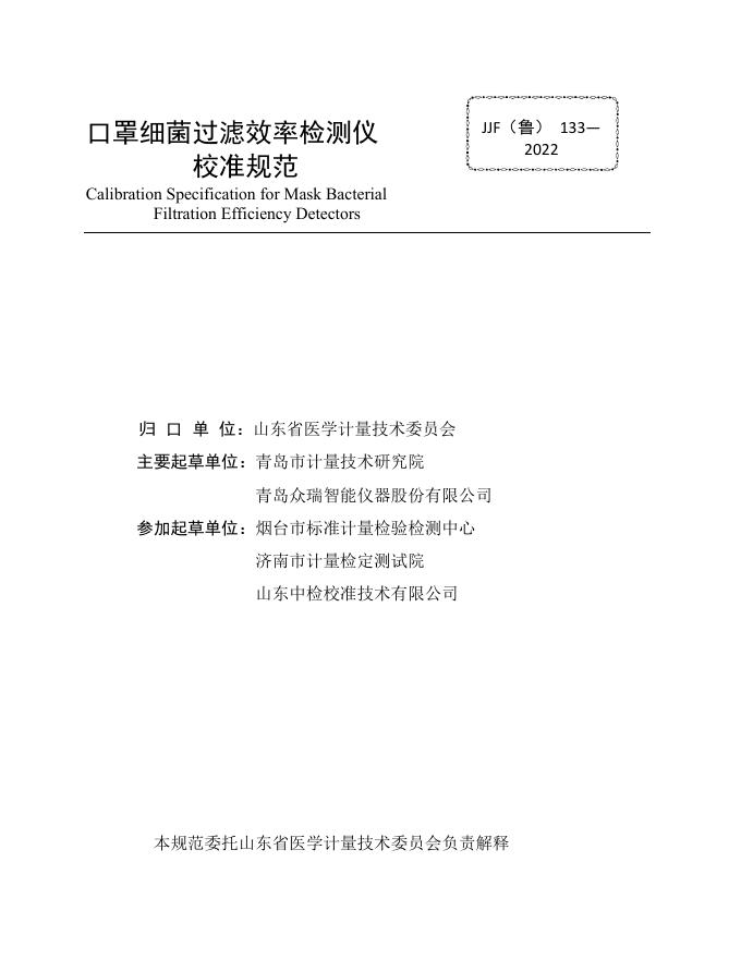 JJF(鲁)133-2022 口罩细菌过滤效率检测仪校准规范