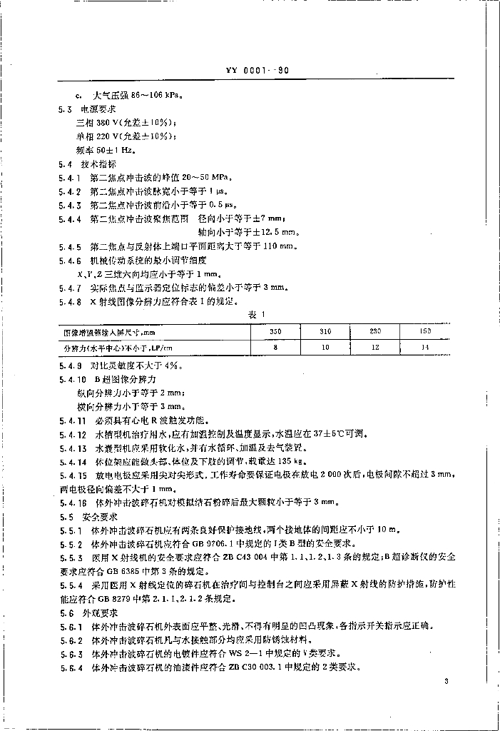 YY 0001-1990 体外冲击波碎石机通用技术条件