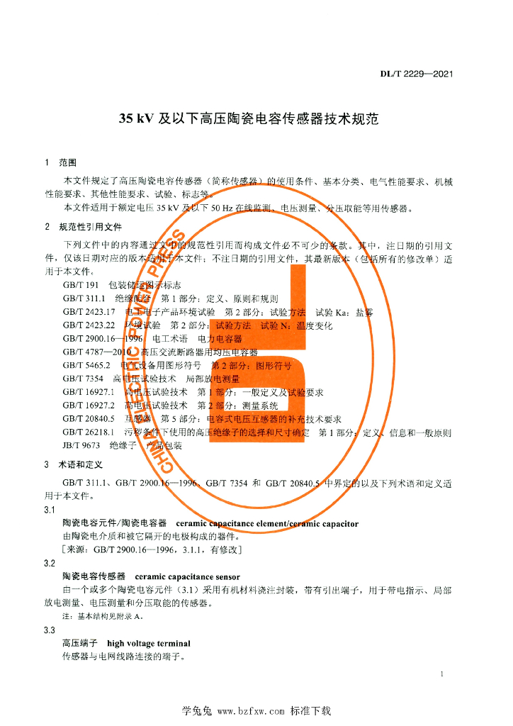 DL/T 2229-2021 35kV及以下高压陶瓷电容传感器技术规范