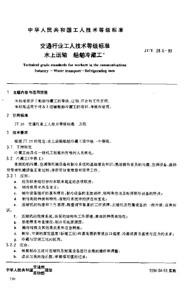 JT/T 28.6-1993 交通行业工人技术等级标准水上运输船舶冷藏工
