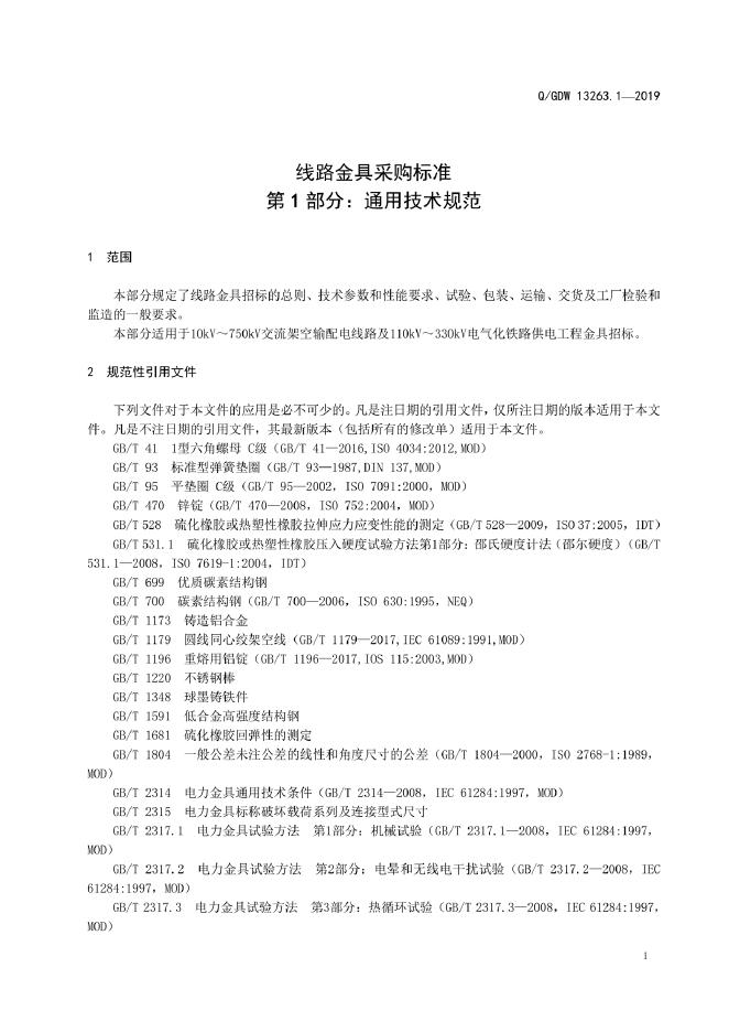 Q/GDW 13263.1-2019 线路金具采购标准 第1部分:通用技术规范