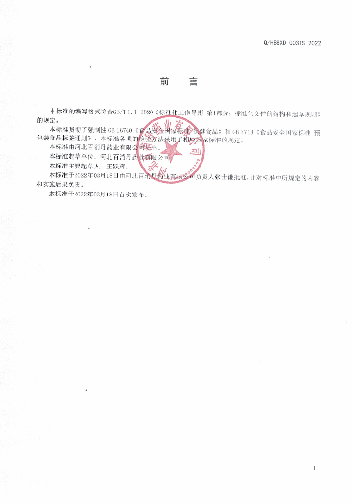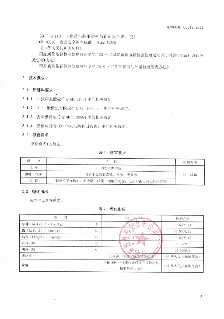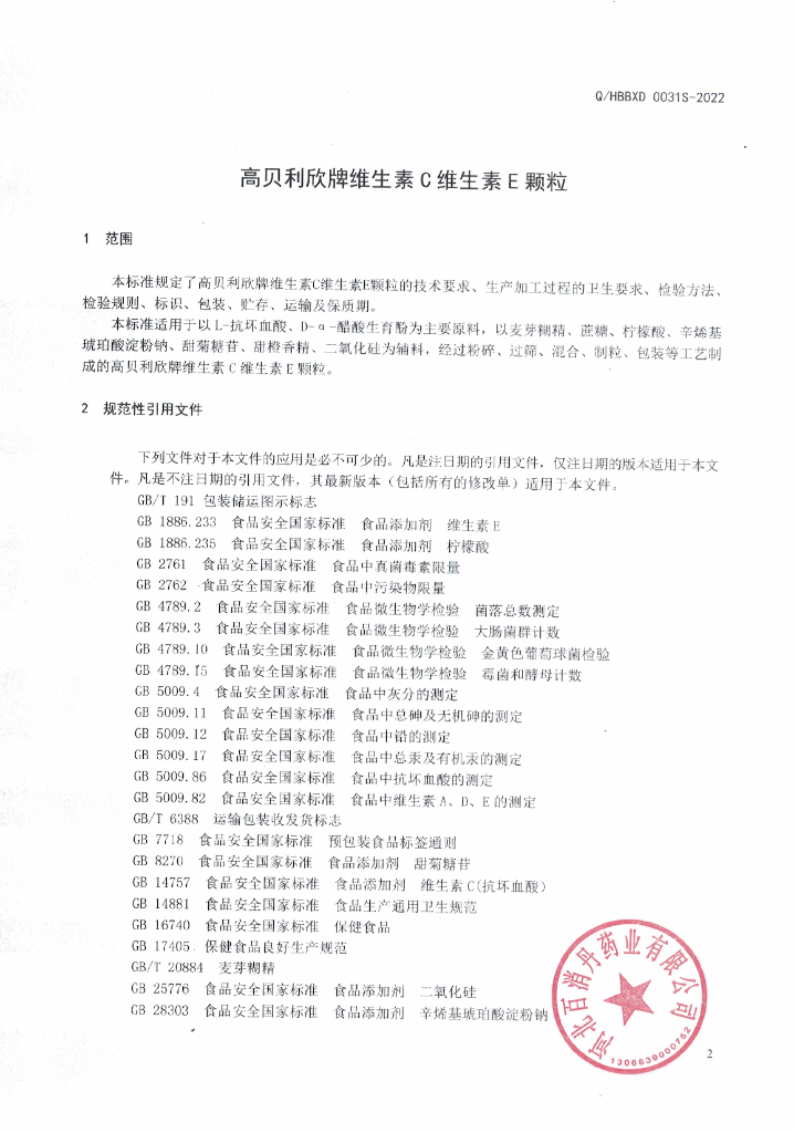 Q/HBBXD 0031S-2022 高贝利欣牌维生素C维生素E颗粒