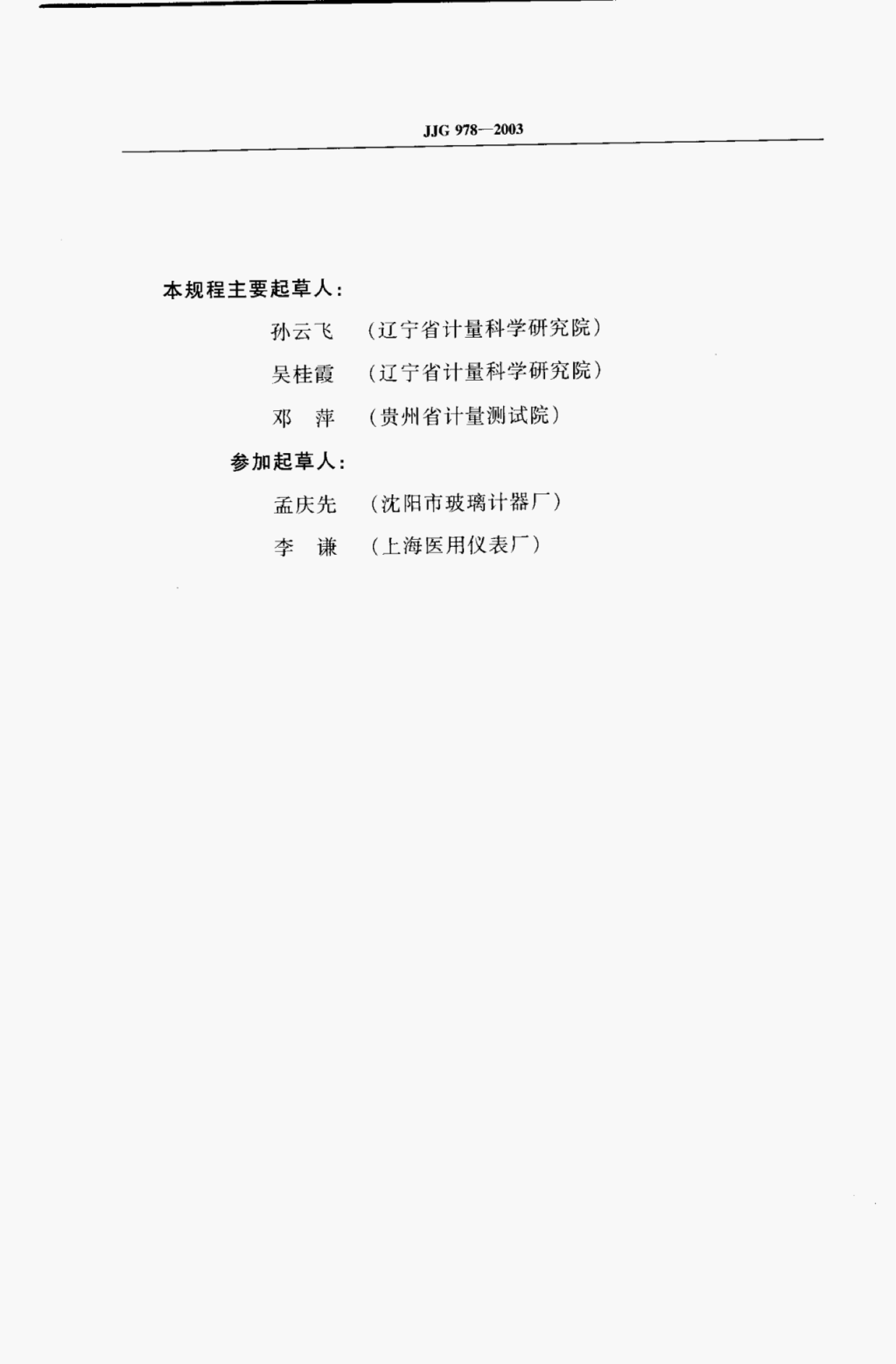 孙云飞(辽宁省计量科学研究院)、吴桂霞(辽宁省计量科学研究院)、邓萍(贵州省计量测试院)、孟庆先(沈阳市玻璃计器厂)、李谦(上海医用仪表厂)