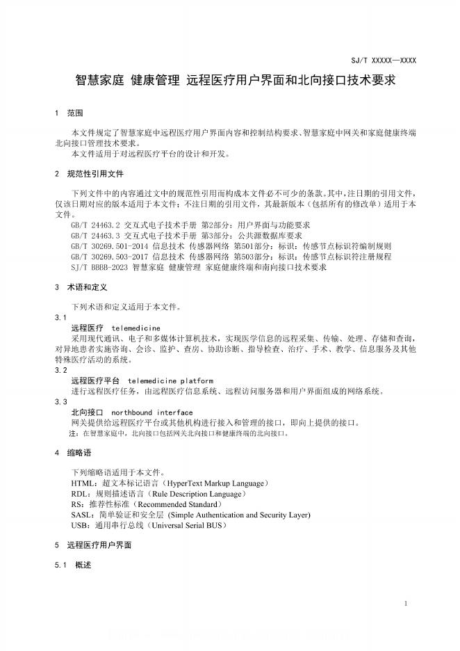 SJ/T 11933-2024 智慧家庭 健康管理 远程医疗用户界面和北向接口技术要求(报批稿)
