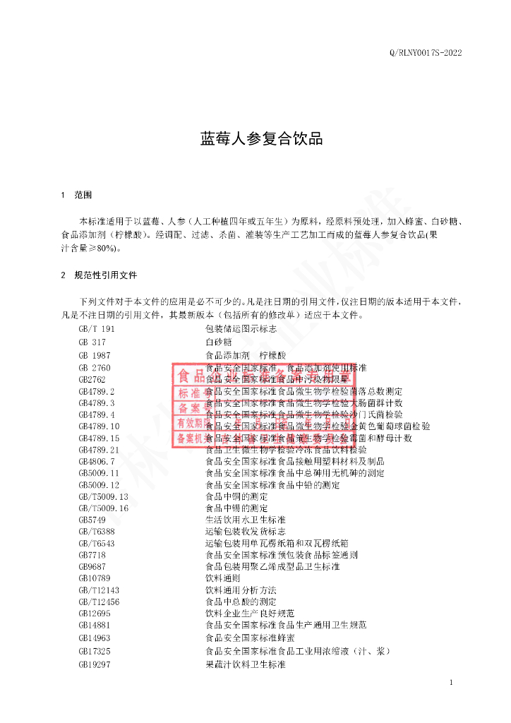 Q/RLNY 0017S-2022 蓝莓人参复合饮品