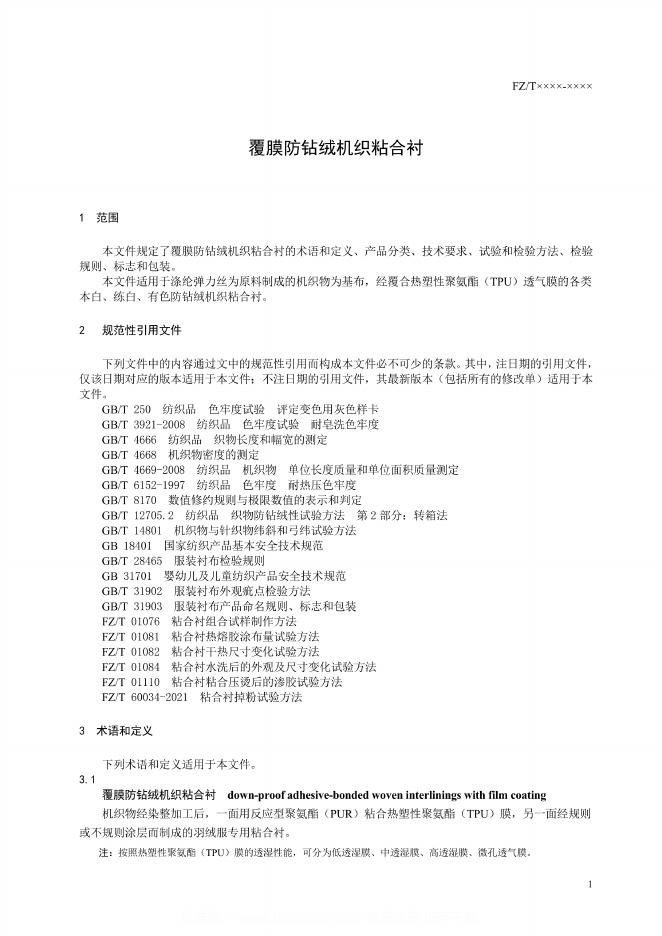 FZ/T 64100-2023 覆膜防钻绒机织粘合衬(报批稿)