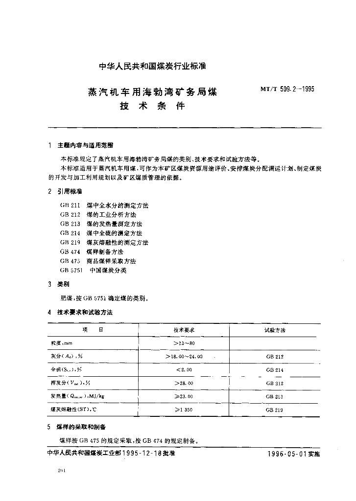 MT/T 509.2-1995 蒸汽机车用海勃湾矿务局煤技术条件