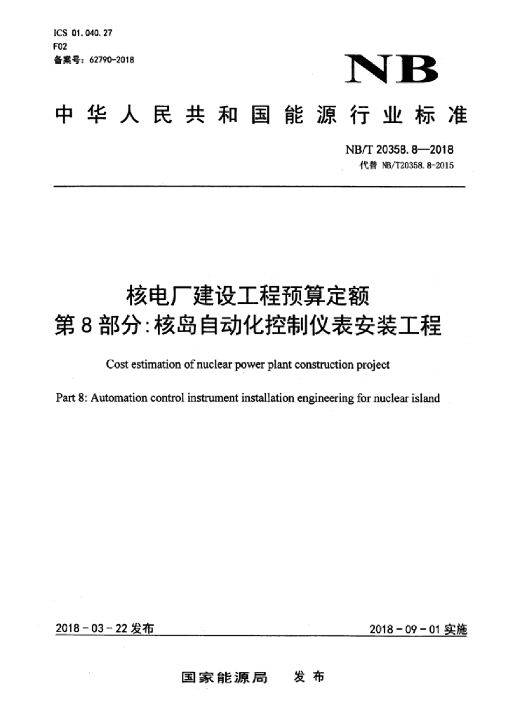 NB/T 20358.8-2018 核电厂建设工程预算定额 第8部分:核岛自动化控制仪表安装工程