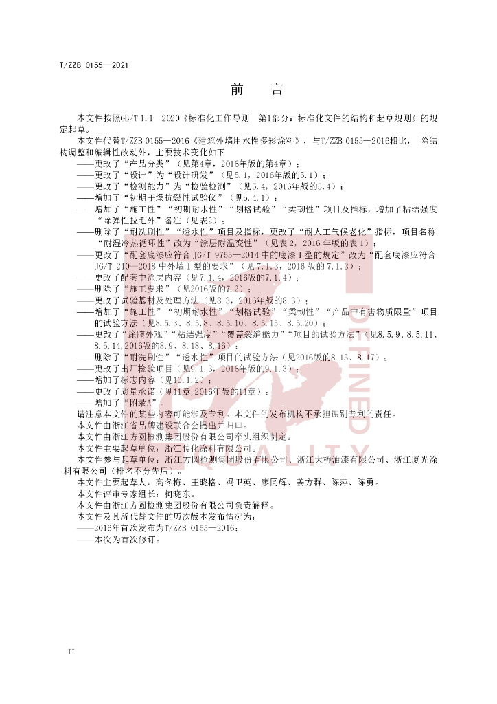 本标准由浙江省质量检测科学研究院牵头组织制订。、本标准主要起草单位:浙江传化涂料有限公司。、本标准参与起草单位:浙江省质量检测科学研究院、浙江天女集团制漆有限公司、浙江厦光涂料有限公司、浙江曼得丽涂料有限公司(排名不分先后)。