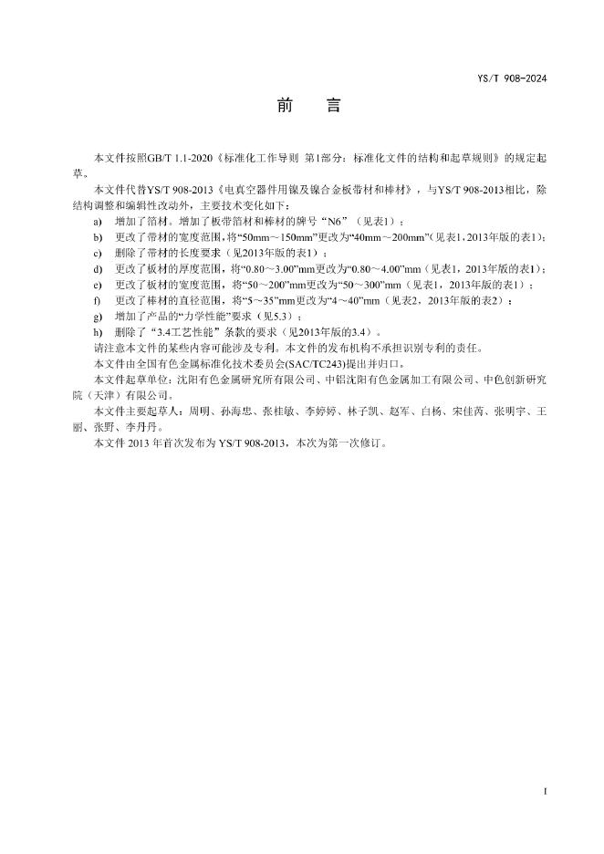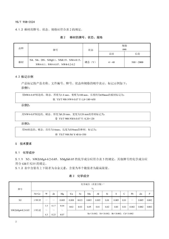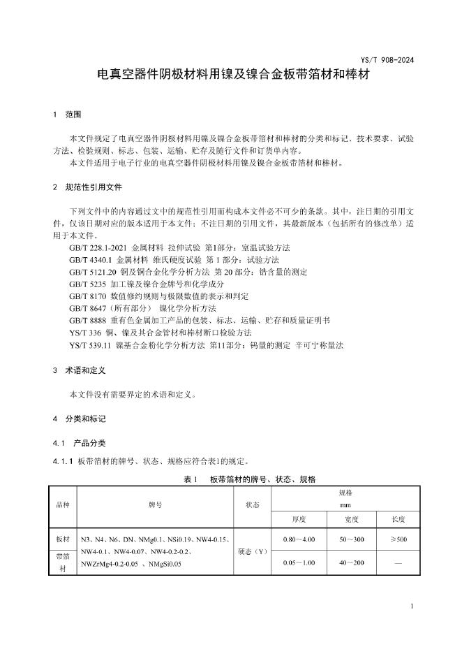 YS/T 908-2024 电真空器件阴极材料用镍及镍合金板带箔材和棒材