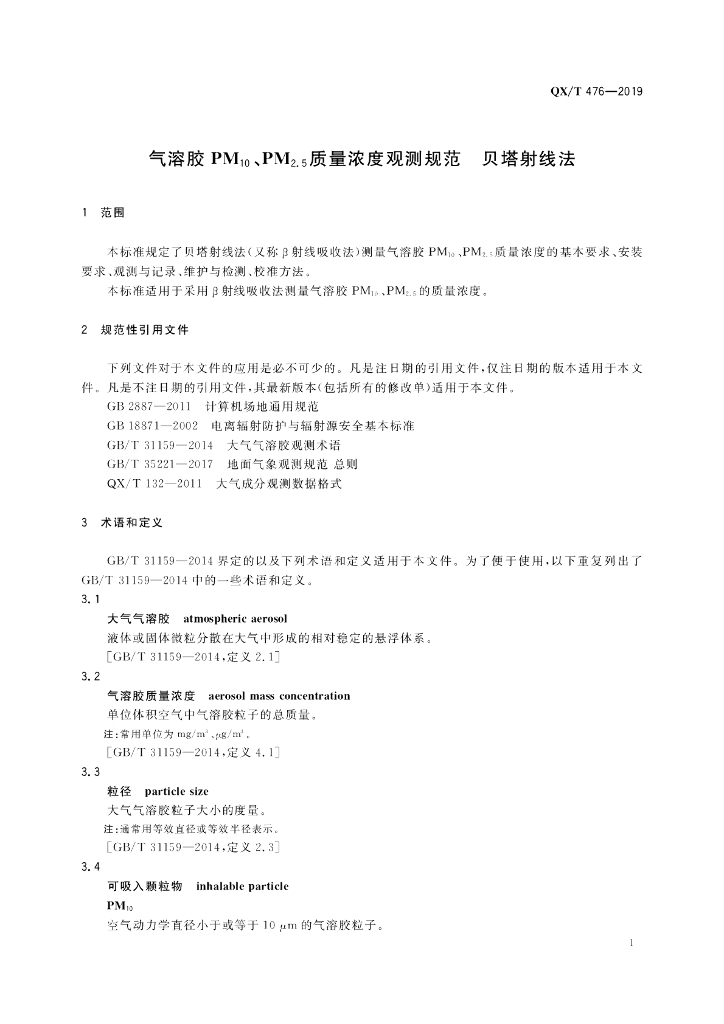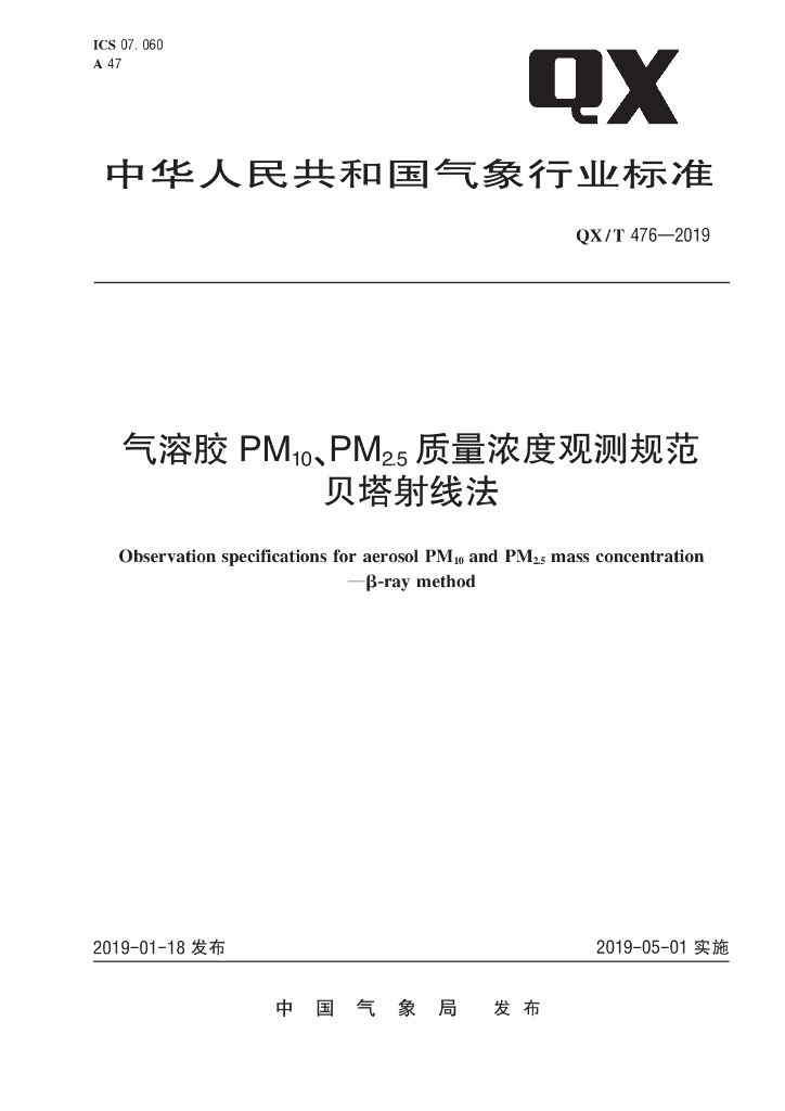QX/T 476-2019 气溶胶PM10、PM2.5质量浓度观测规范 贝塔射线法