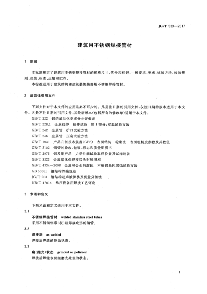 JG/T 539-2017 建筑用不锈钢焊接管材