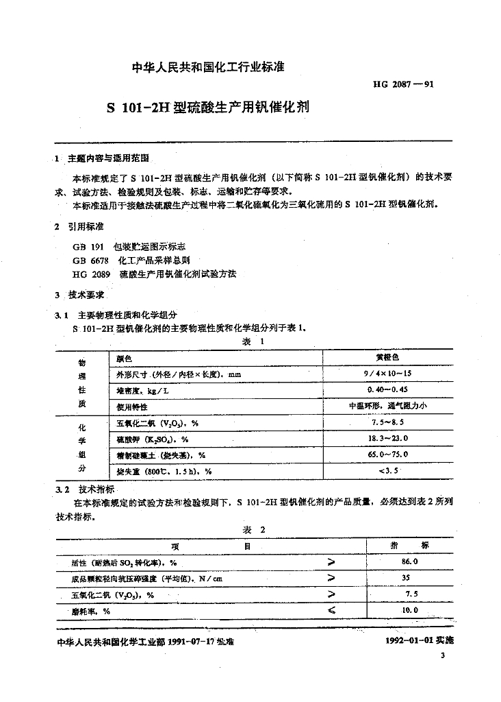 HG 2087-1991 S 101-2H 型硫酸生产用钒催化剂