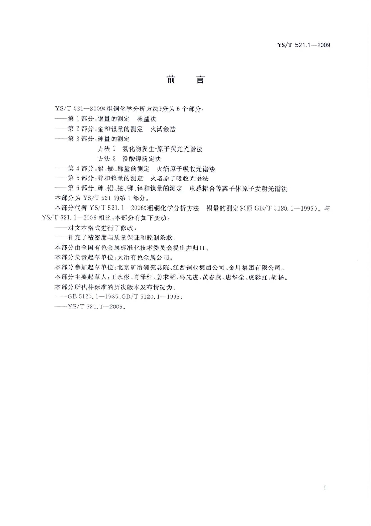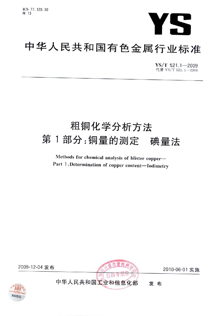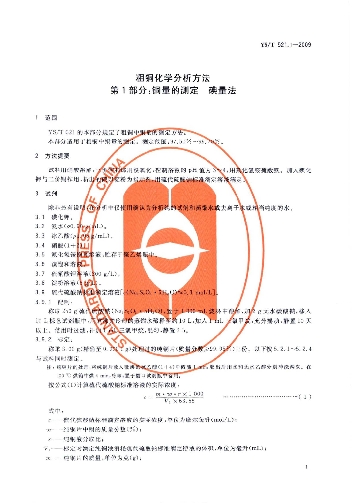 YS/T 521.1-2009 粗铜化学分析方法 第1部分:铜量的测定 碘量法