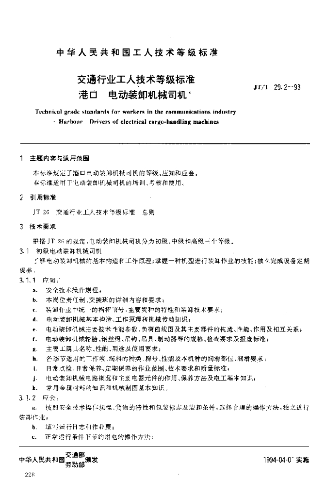JT/T 29.2-1993 交通行业工人技术等级标准港口电动装卸机械司机