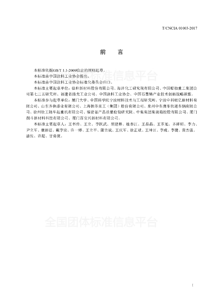 信和新材料股份有限公司、海洋化工研究院有限公司、中国船舶重工集团公司第七二五研究所、福建省腾龙工业公司、中国涂料工业协会、中国石墨烯产业技术创新战略联盟、厦门大学、中国科学院宁波材料技术与工程研究所、宁波中科银亿新材料有限公司、山东齐鲁漆业有限公司、上海振华重工(集团)股份有限公司、泉州中车唐车轨道车辆有限公司、徐州徐工随车起重机有限公司、福建省产品质量检验研究院、中集集团集装箱控股有限公司、厦门捌斗新材料科技有限公司、厦门百安兴新材料有限公司