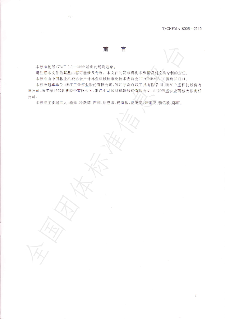 浙江三锋实业股份有限公司、浙江宇森百联工具有限公司、浙江中坚科技股份有限公司、浙江派尼尔科技股份有限公司、浙江中马园林机器股份有限公司、山东华盛农业药械有限责任公司。