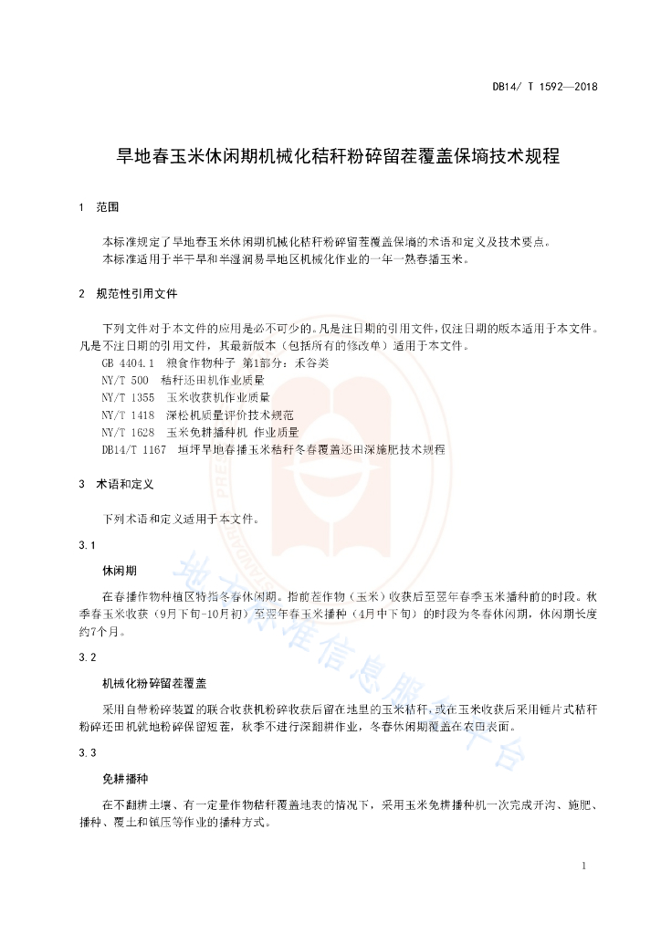 DB14/T 1592-2018 旱地春玉米休闲期机械化秸秆粉碎留茬覆盖保墒技术规程