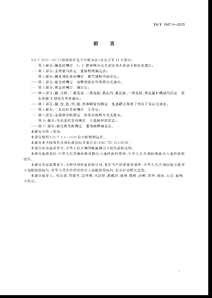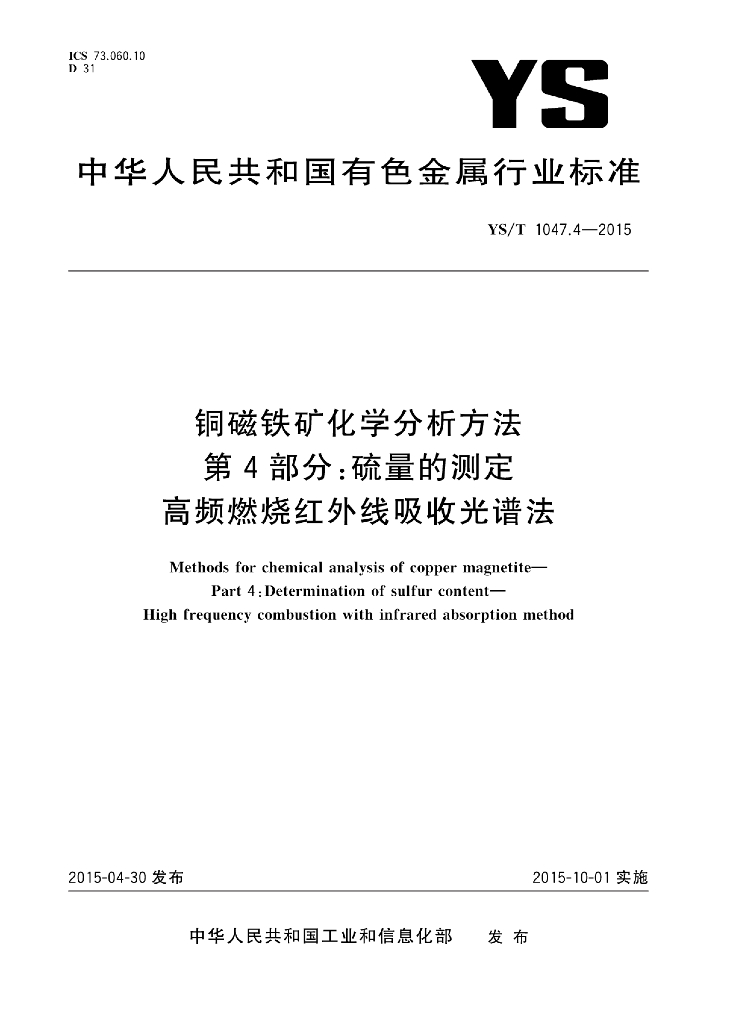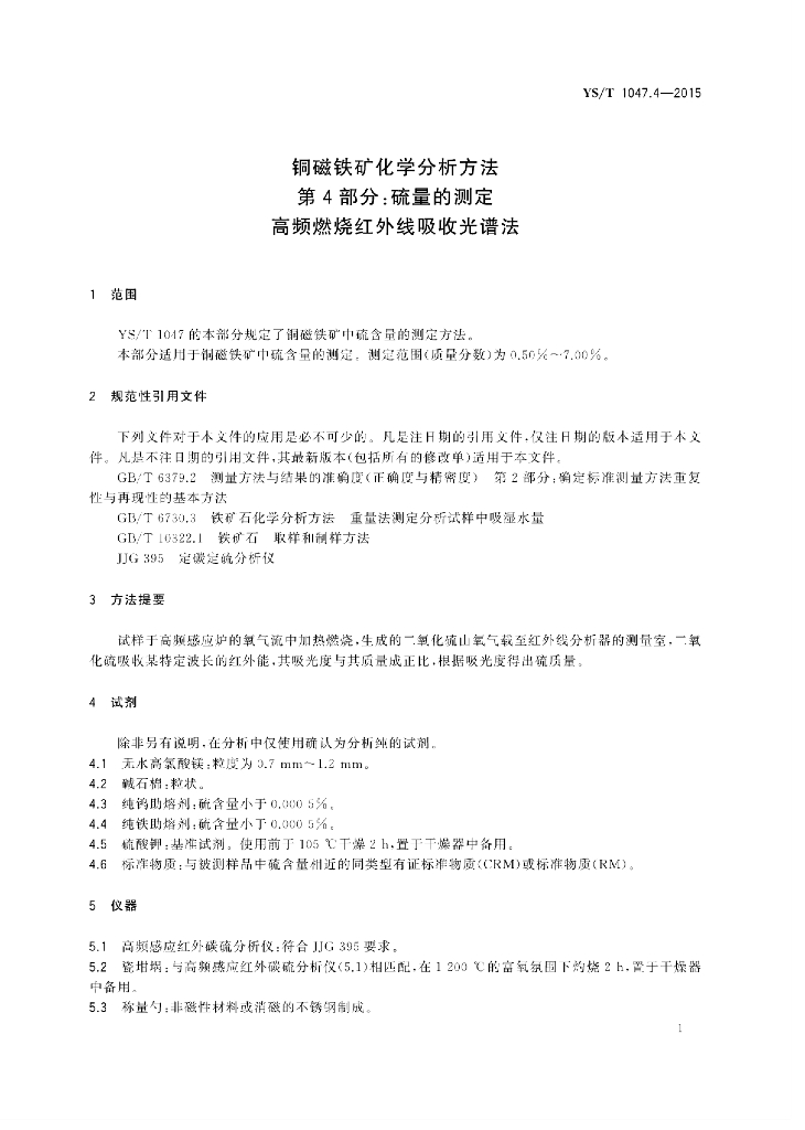 YS/T 1047.4-2015 铜磁铁矿化学分析方法 第4部分:硫量的测定 高频燃烧红外线吸收光谱法