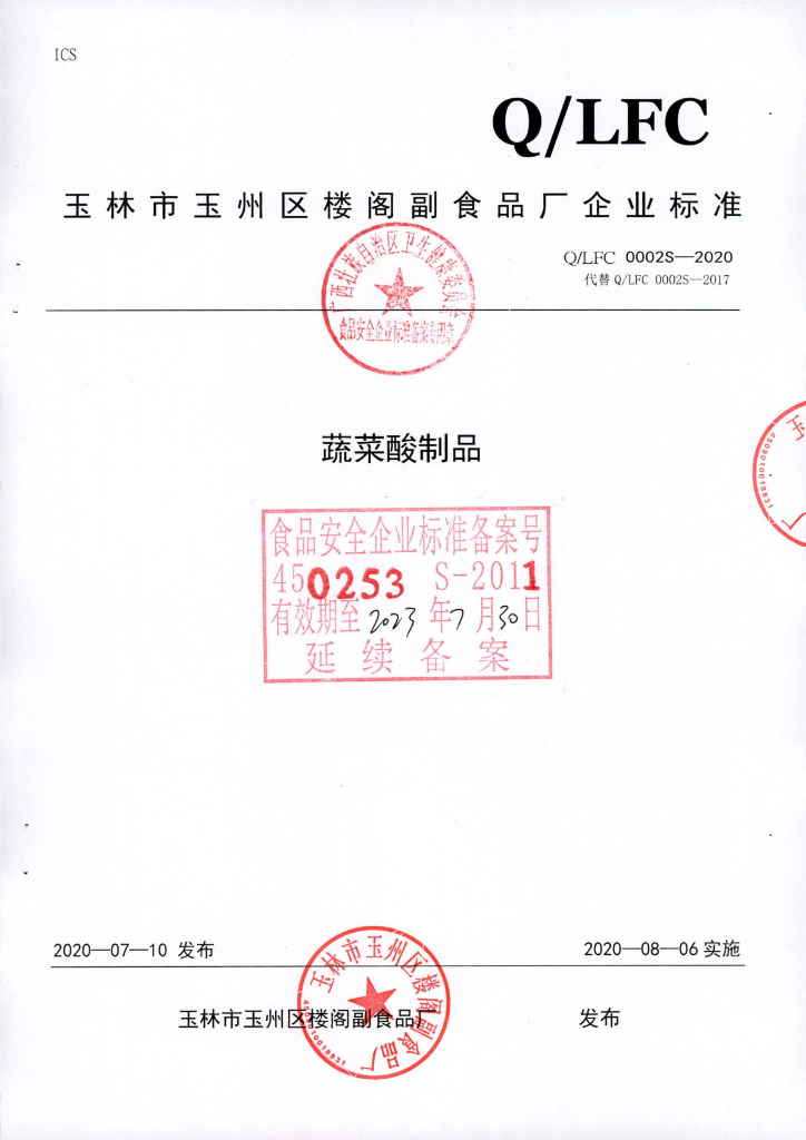 Q/LFC 0002S-2020 蔬菜酸制品