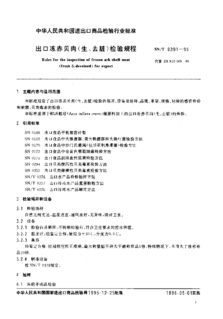 SN/T 0391-1995 出口冻赤贝肉(生、去脏)检验规程