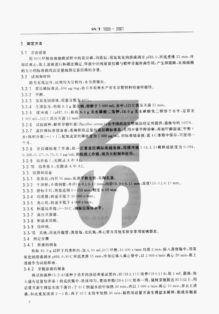 SN/T 1005-2001 出口肉品中富拉磷残留量检验方法杯碟法