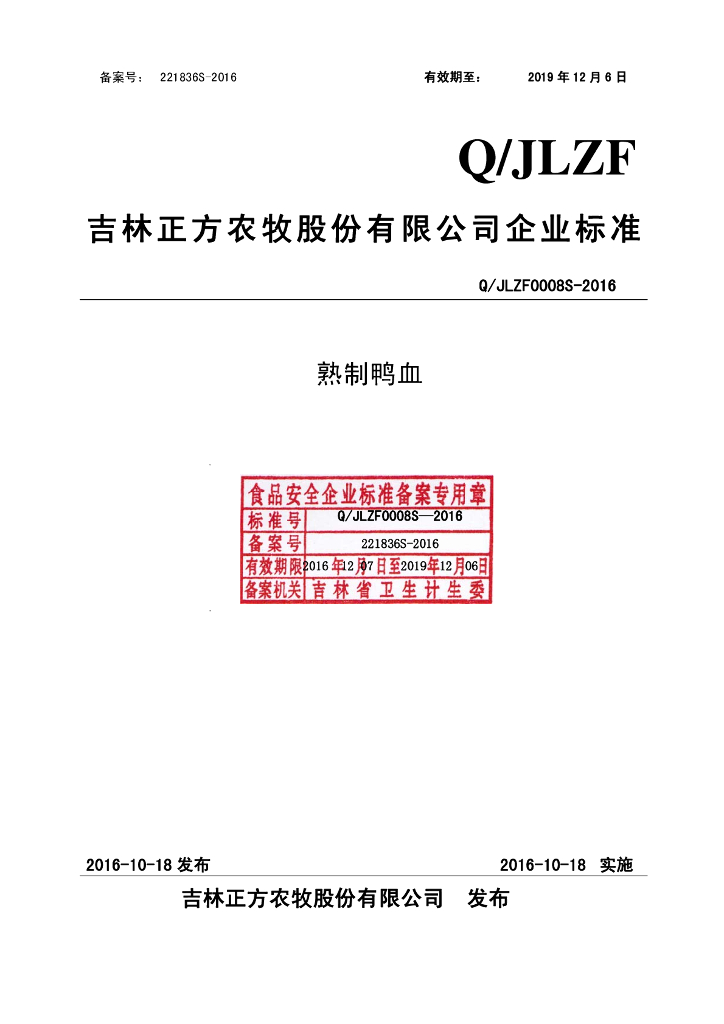 Q/JLZF 0008S-2016 吉林正方农牧股份有限公司 熟制鸭血