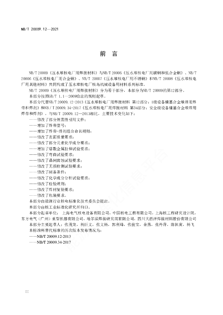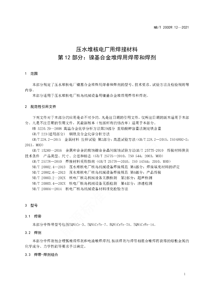 NB/T 20009.12-2021 压水堆核电厂用焊接材料 第12部分:镍基合金堆焊用焊带和焊剂