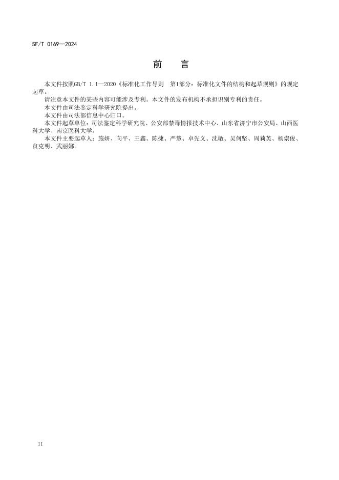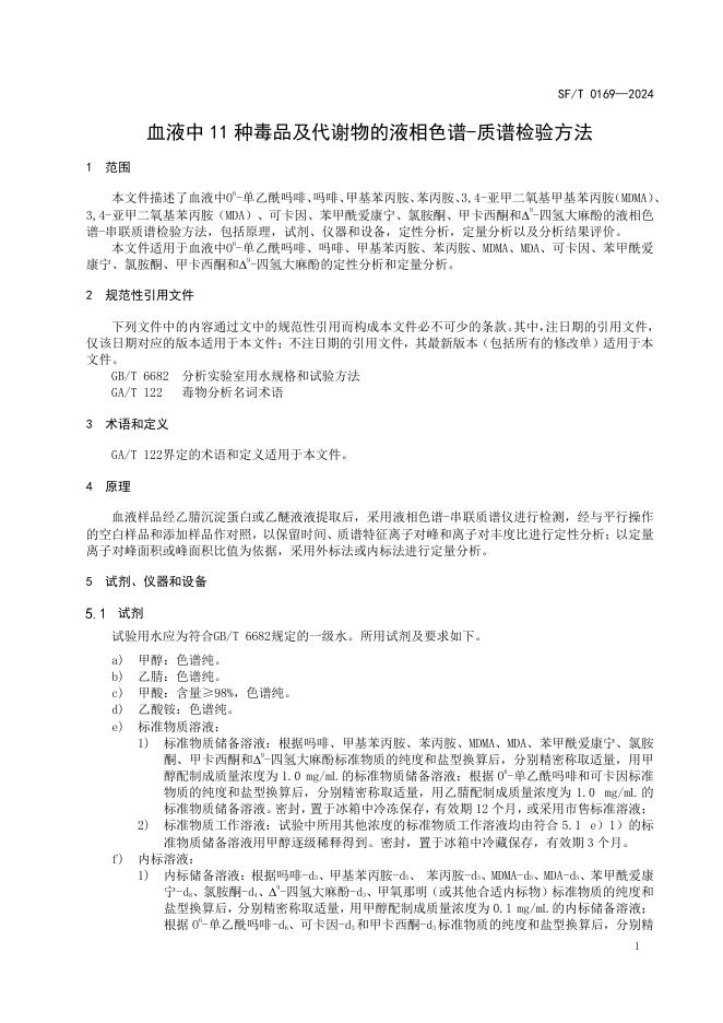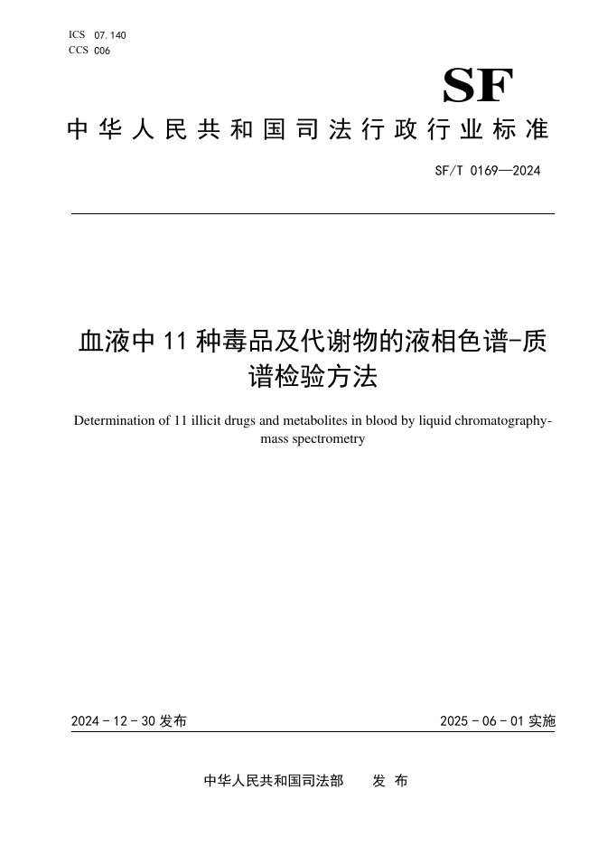 SF/T 0169-2024 血液中11种毒品及代谢物的液相色谱-质谱检验方法