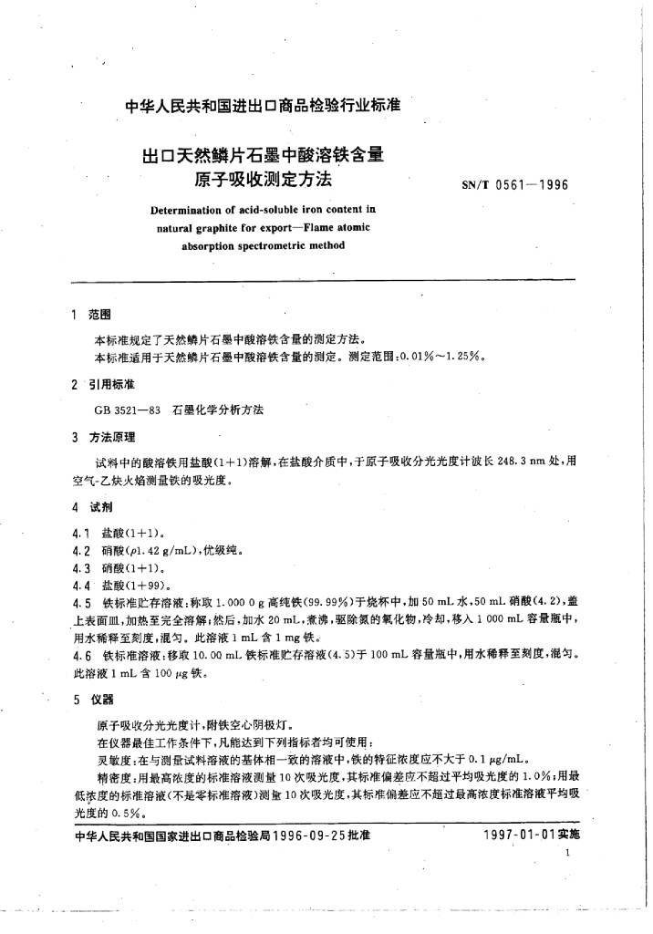 SN/T 0561-1996 出口天然鳞片石墨中酸溶铁含量原子吸收测定方法