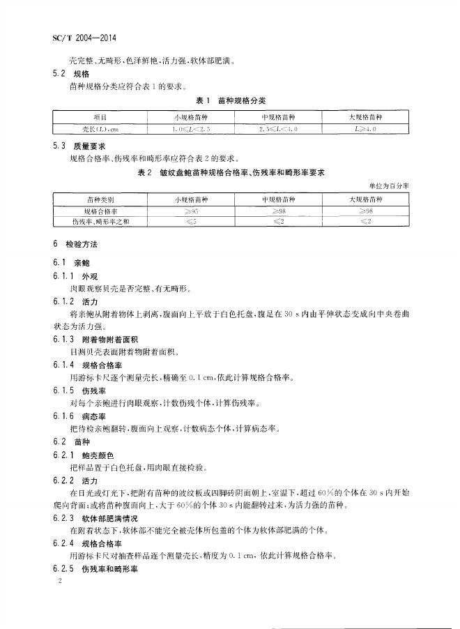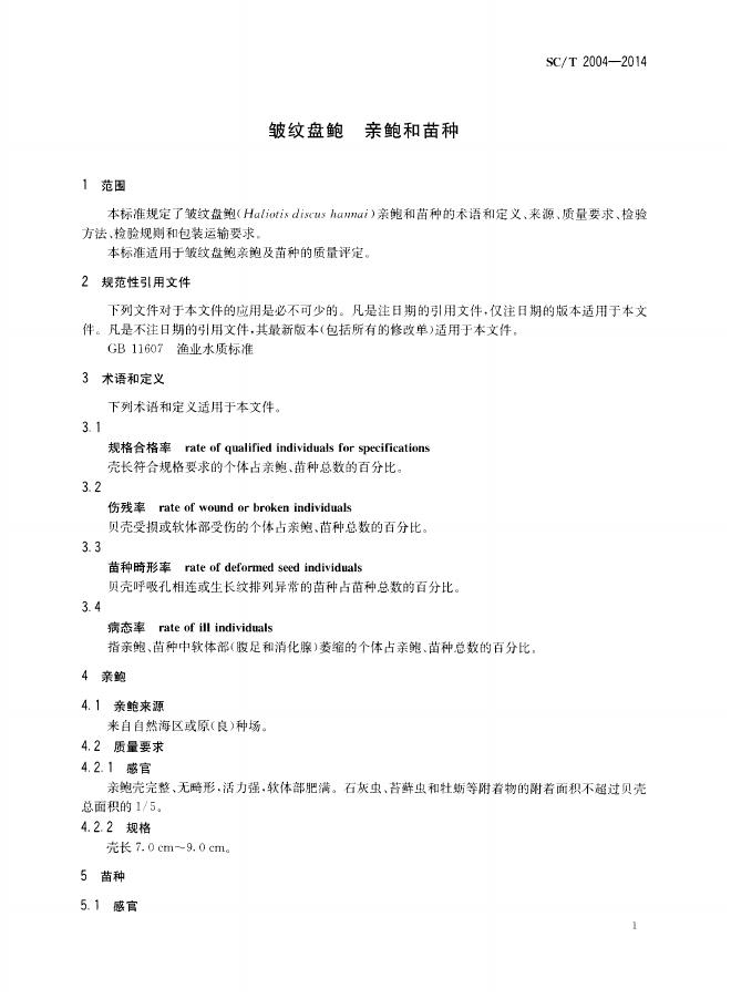 SC/T 2004-2014 皱纹盘鲍 亲鲍和苗种