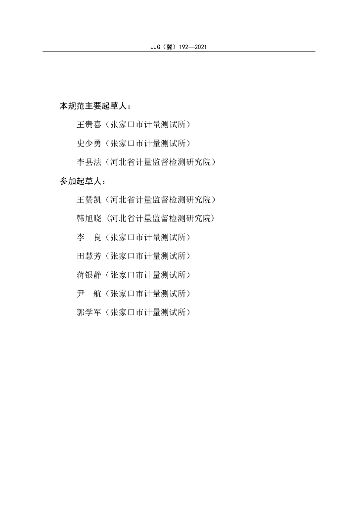 王贵喜(张家口市计量测试所)、史少勇(张家口市计量测试所)、李县法(河北省计量监督检测研究院)、王赞凯(河北省计量监督检测研究院)、韩旭晓(河北省计量监督检测研究院)、李良(张家口市计量测试所)、田慧芳(张家口市计量测试所)、蒋银静(张家口市计量测试所)、尹航(张家口市计量测试所)、郭学军(张家口市计量测试所)