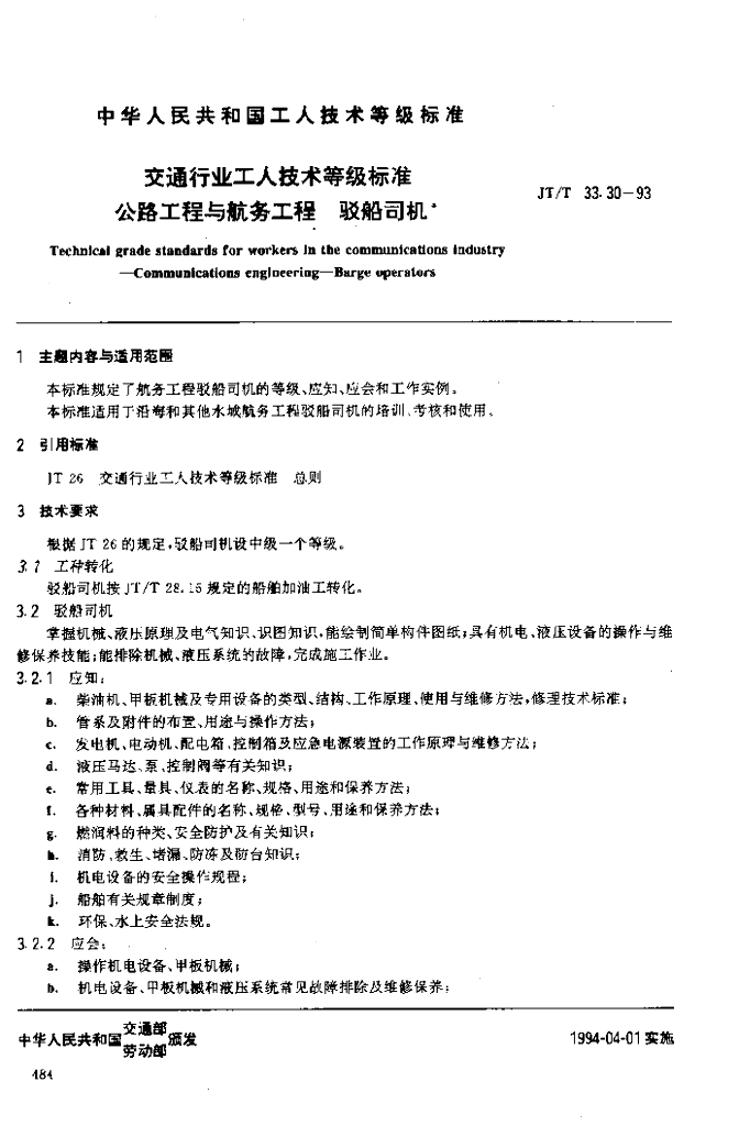 JT/T 33.30-1993 交通行业工人技术等级标准公路工程与航务工程驳船司机