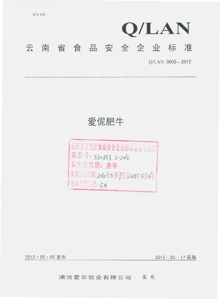 Q/LAN 0003S-2012 爱伲肥牛