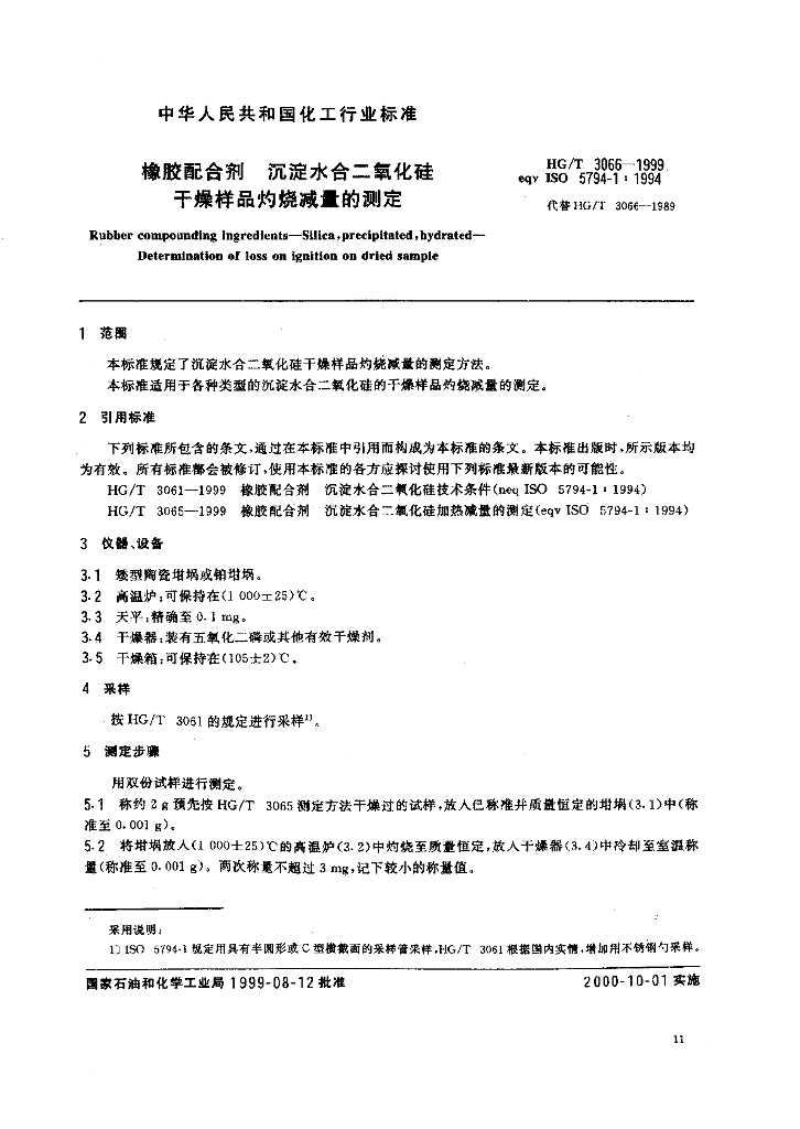 HG/T 3066-1999 橡胶配合剂 沉淀水合二氧化硅干燥样品灼烧减量的测定
