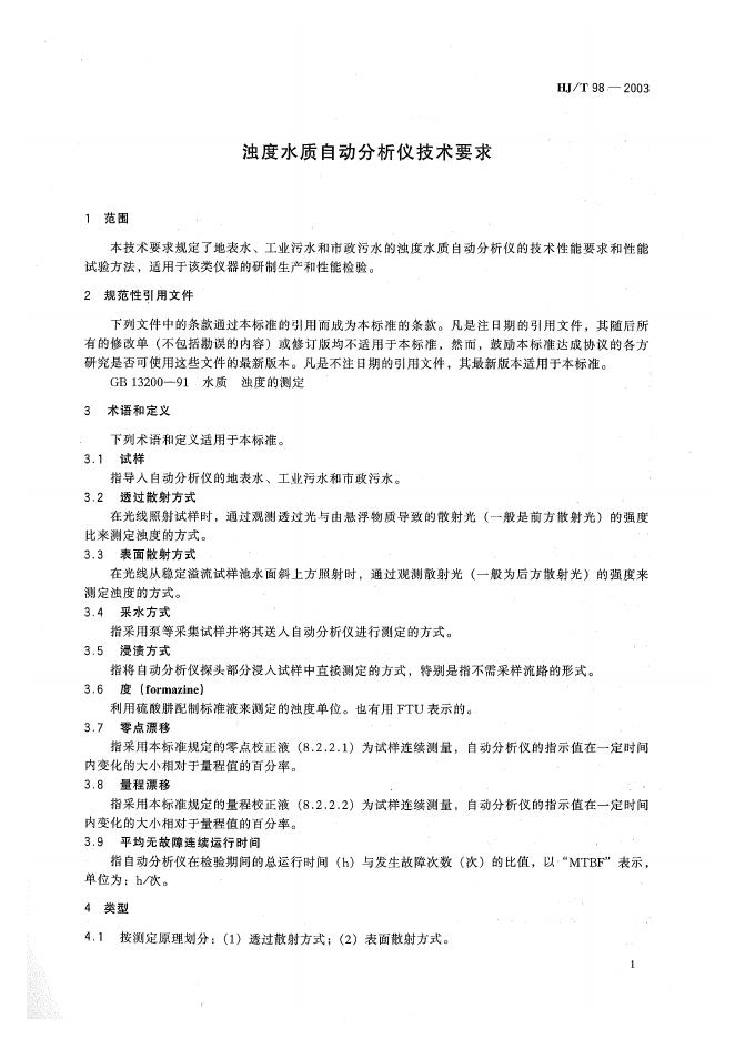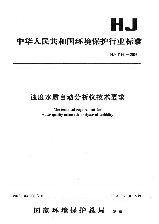 HJ/T 98-2003 浊度水质自动分析仪技术要求