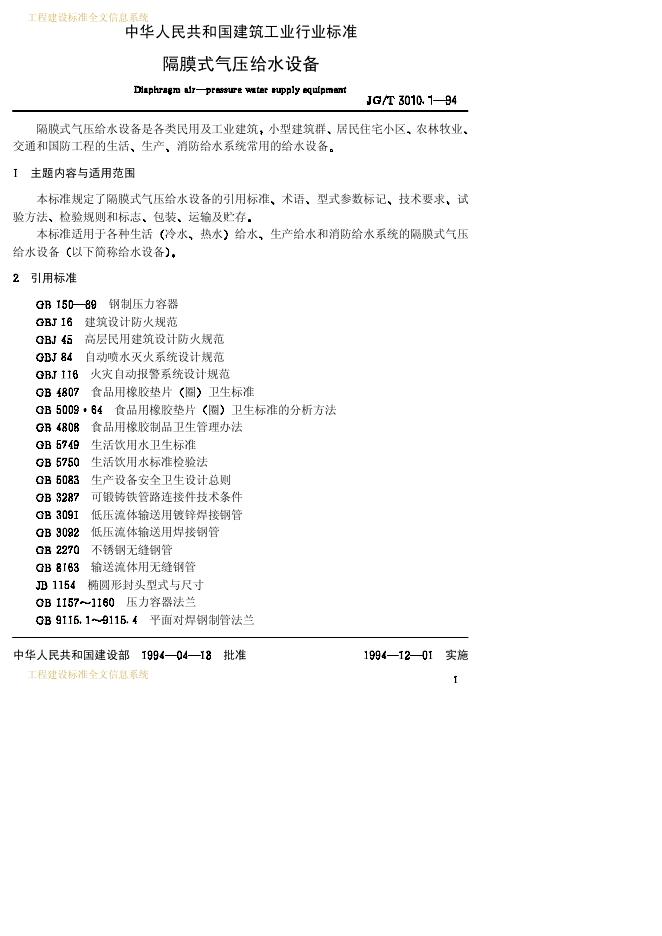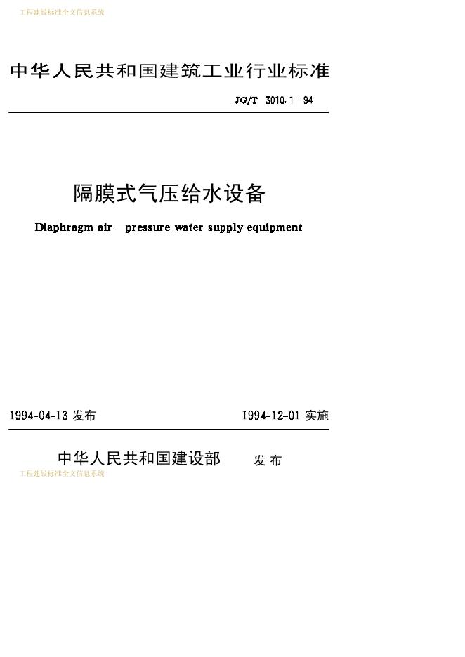 CJ/T 3010.1-1994 隔膜式气压给水设备