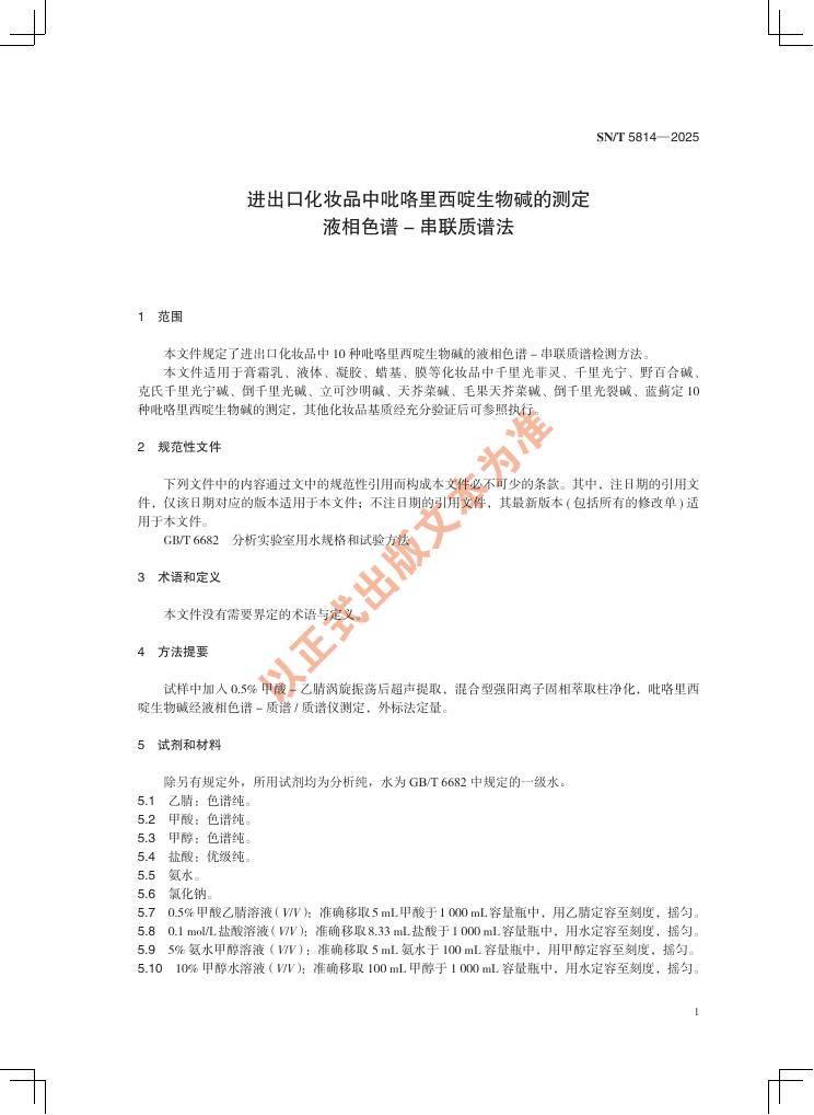SN/T 5814-2025 进出口化妆品中吡咯里西啶生物碱的测定 液相色谱-串联质谱法