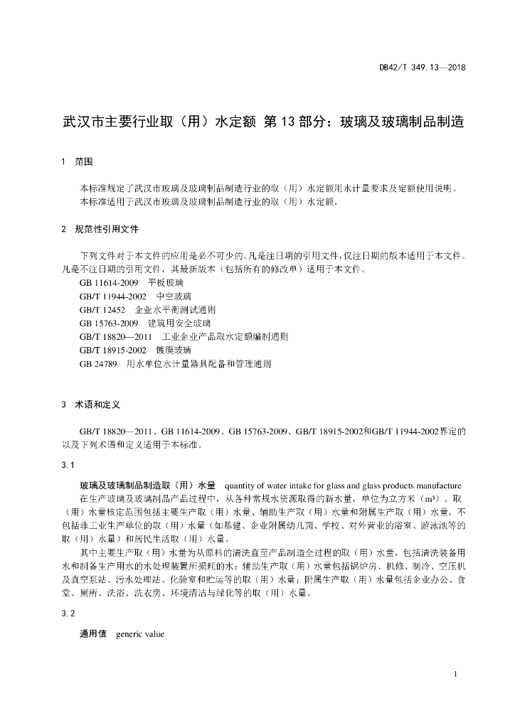 DB42/T 349.13-2018 武汉市主要行业取(用)水定额 第13部分:玻璃及玻璃制品制造