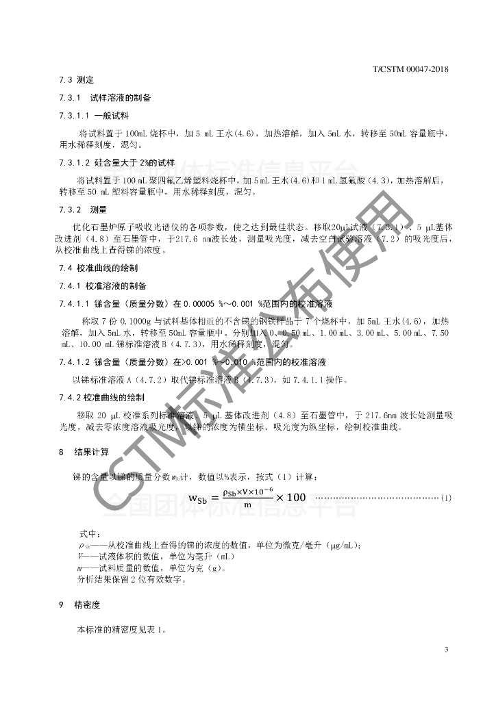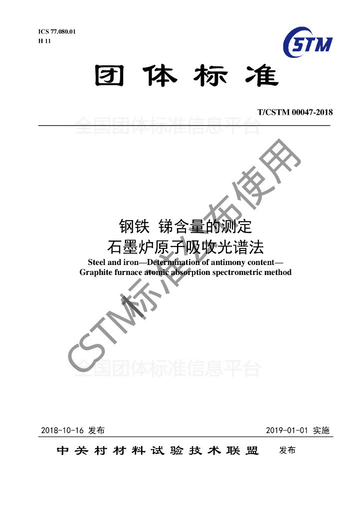 T/CSTM 00047-2018 钢铁 锑含量的测定 石墨炉原子吸收光谱法