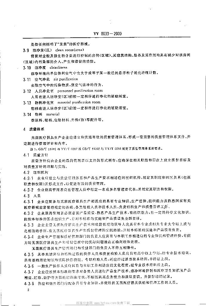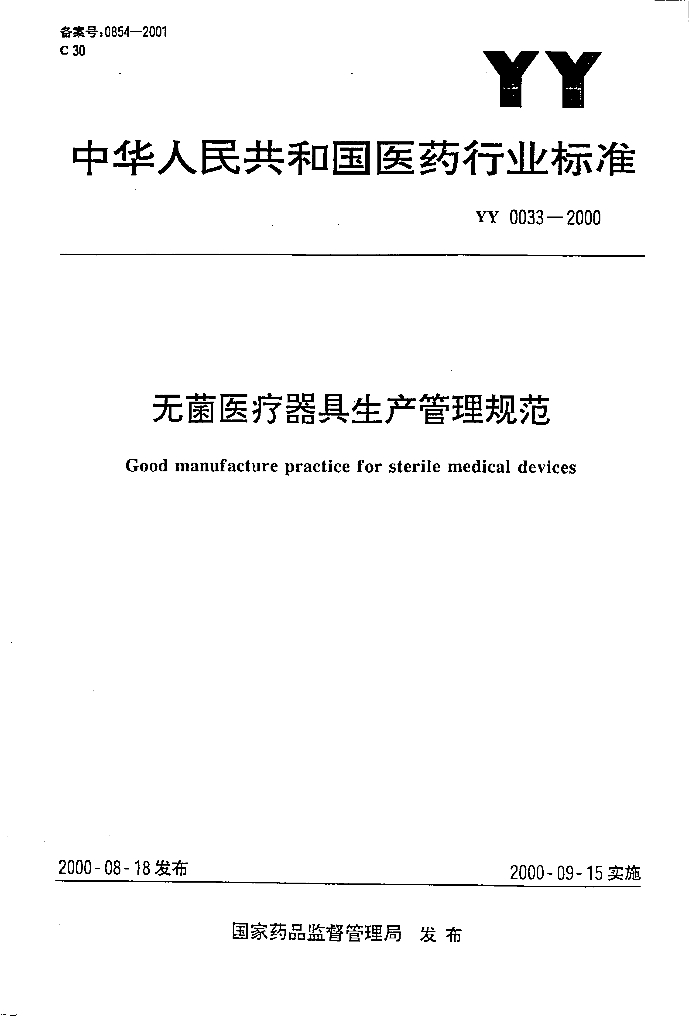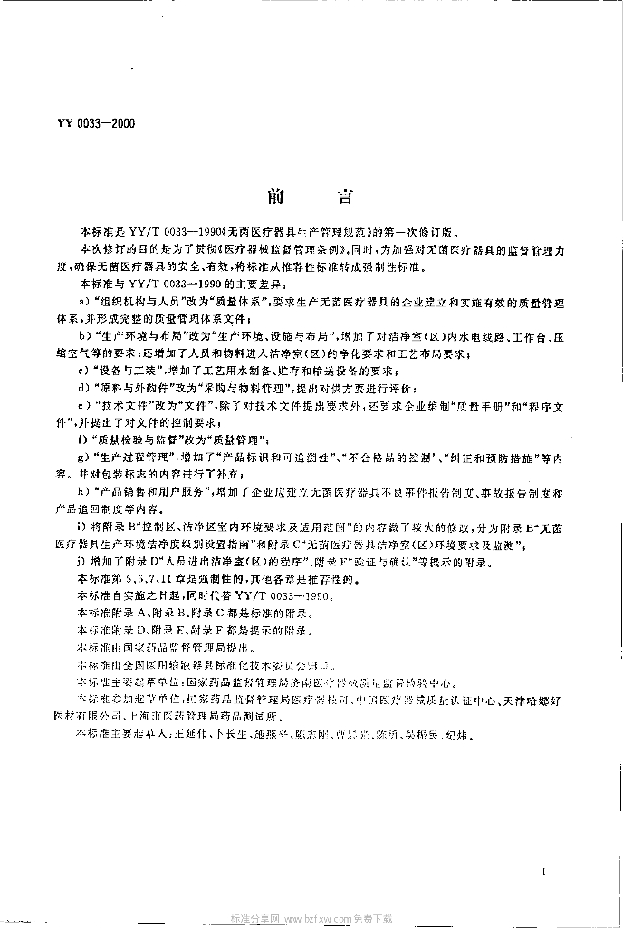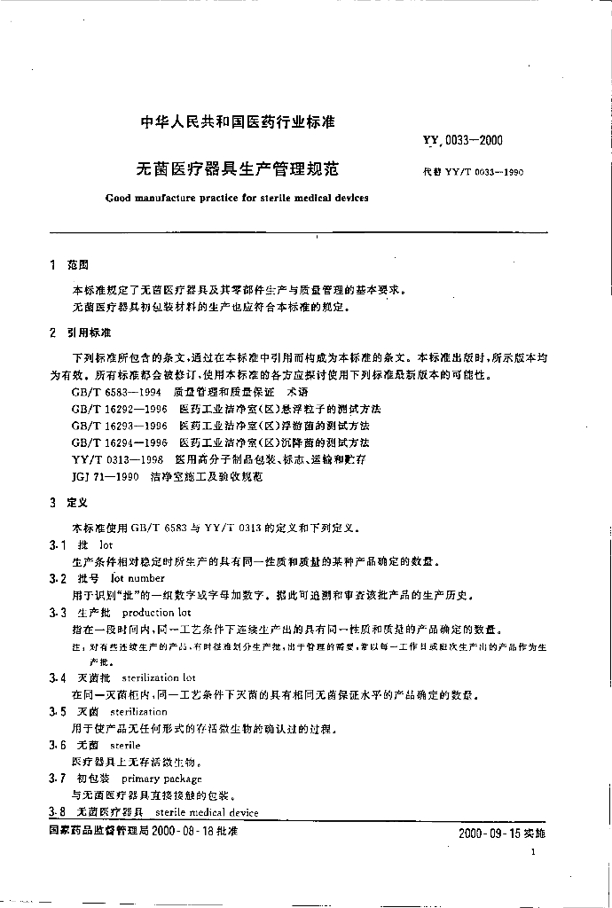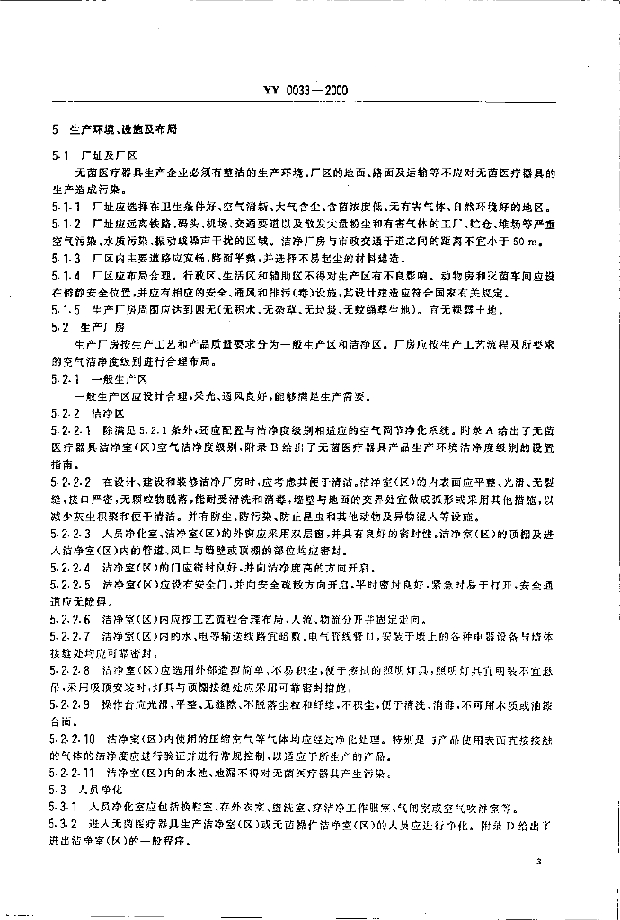 YY 0033-2000 无菌医疗器具生产管理规范