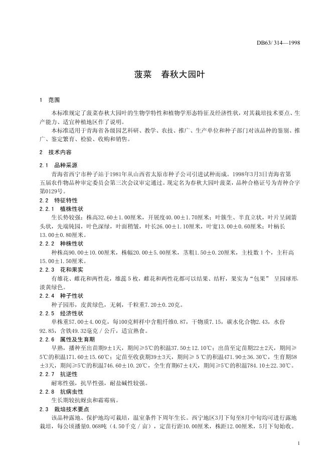 DB63/T 314-1998 春秋大园叶菠菜品种