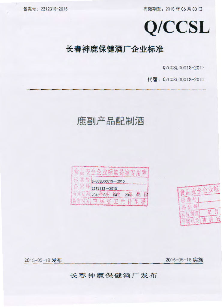 Q/CCSL 0001S-2015 长春神鹿保健酒厂 鹿副产品配制酒