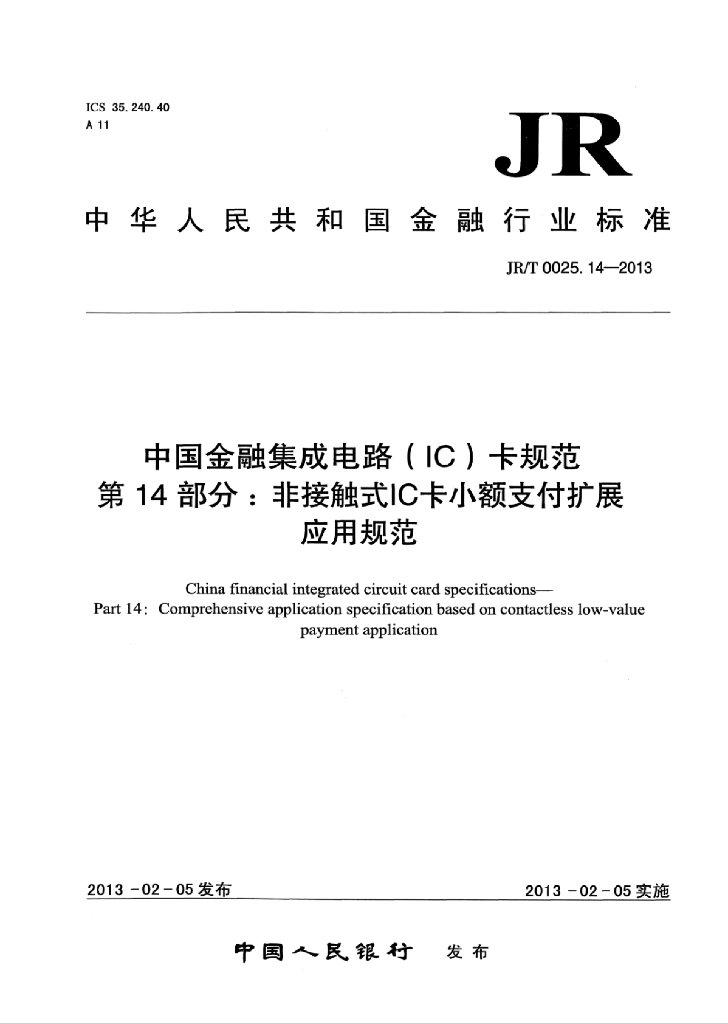 JR/T 0025.14-2013 中国金融集成电路(IC)卡规范 第14部分:非接触式IC卡小额支付扩展应用规范