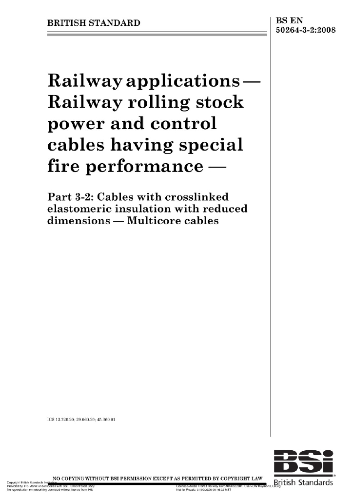 BS EN 50264-3-2:2008 铁路应用-具有特殊防火性能的铁路车辆用电力和控制电缆 第3-2部分 薄壁交联弹性体绝缘电缆-多芯电缆