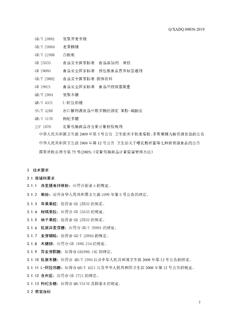 Q/XADQ 0003S-2019 膳食纤维固体饮料