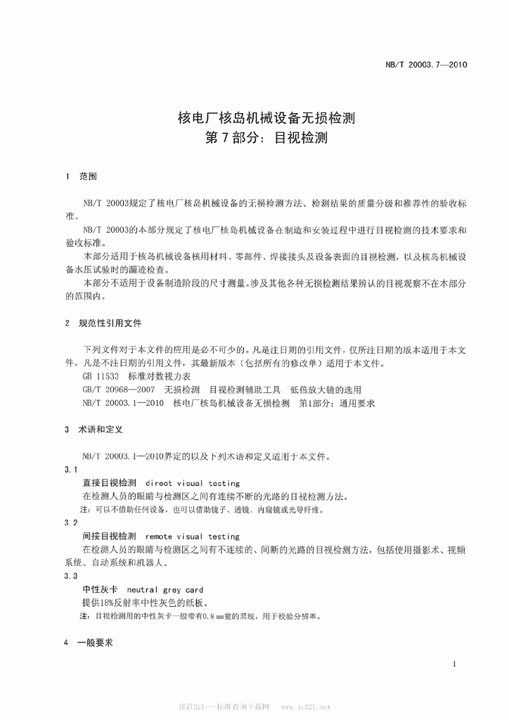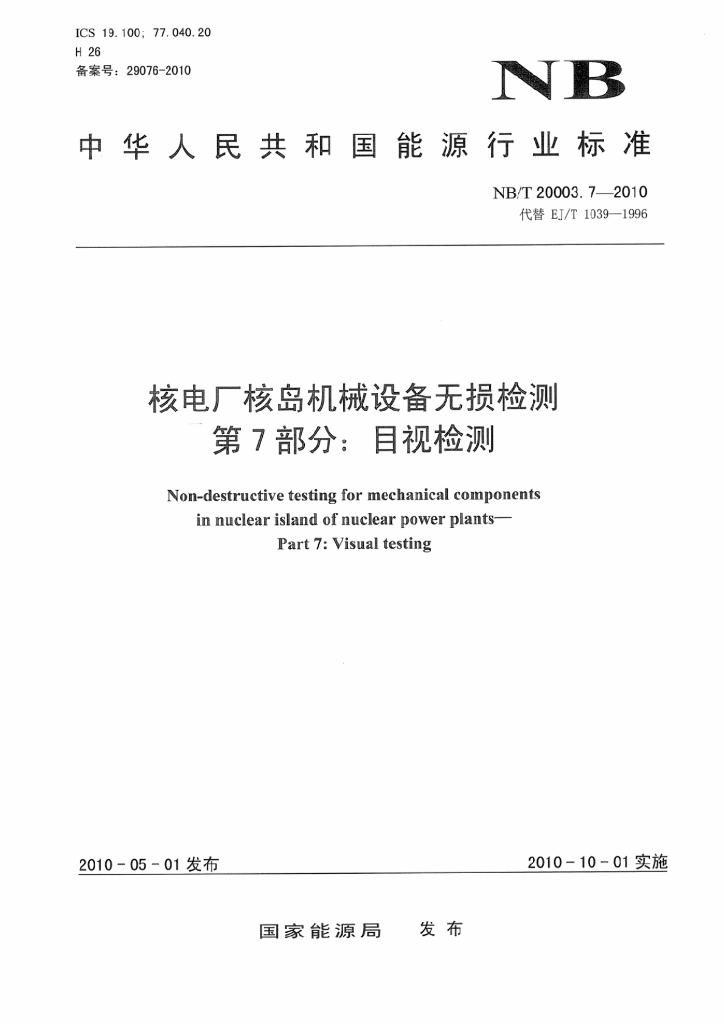 NB/T 20003.7-2010 核电厂核岛机械设备无损检测 第7部分:目视检测