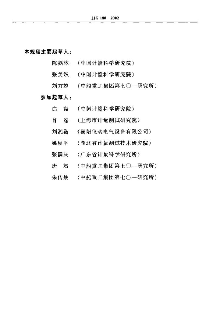 陈剑林(中国计量科学研究院)、张美娥(中国计量科学研究院)、刘方雄(中船重工集团第七○一研究所)、白滢(中国计量科学研究院)、肖鉴(上海市计量测试研究院)、刘湘衡(衡阳仪表电气设备有限公司)、姚秋平(湖北省计量测试技术研究院)、张国庆(广东省计量科学研究所)、唐君(中船重工集团第七○一研究所)、朱传焕(中船重工集团第七○一研究所)